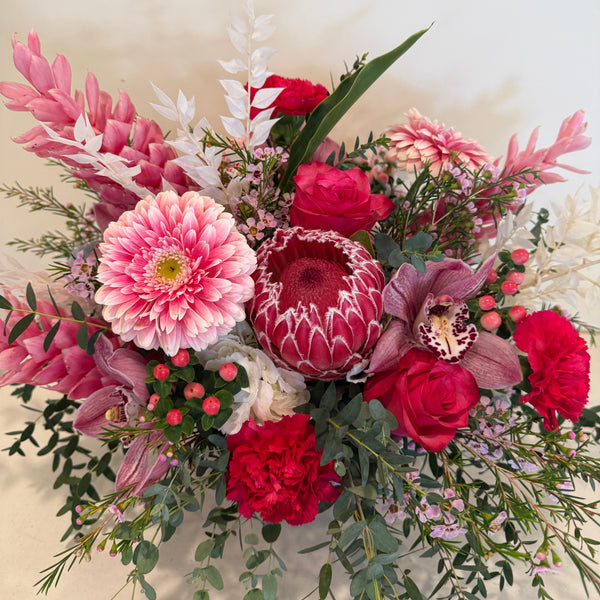 An effortless way to say I love you! Pink floral with a touch of tropical and whimsy in a speckled pink glass vase