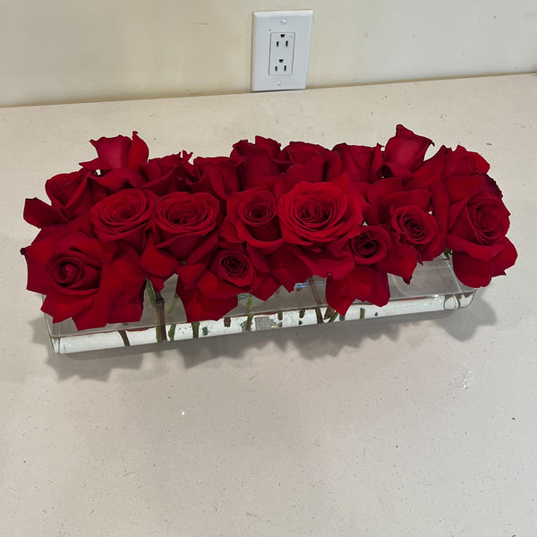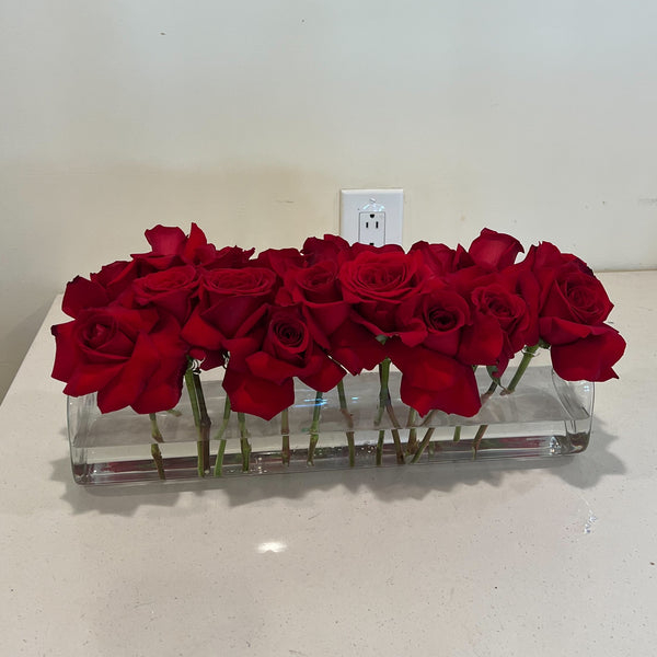 No frills, this arrangement is crafted into a beautiful, sleek rectangular vase, finished with a dozen and a half red roses. It is perfect for any occasion, especially to celebrate love. Gift this piece to your modern love story.